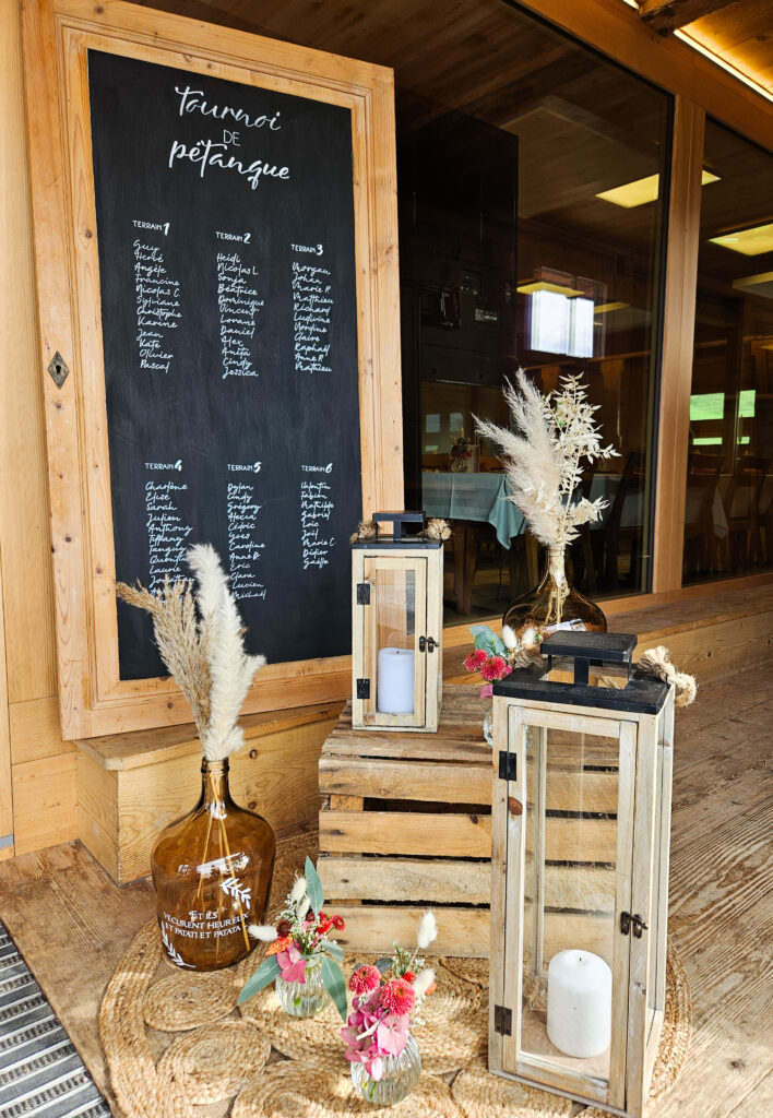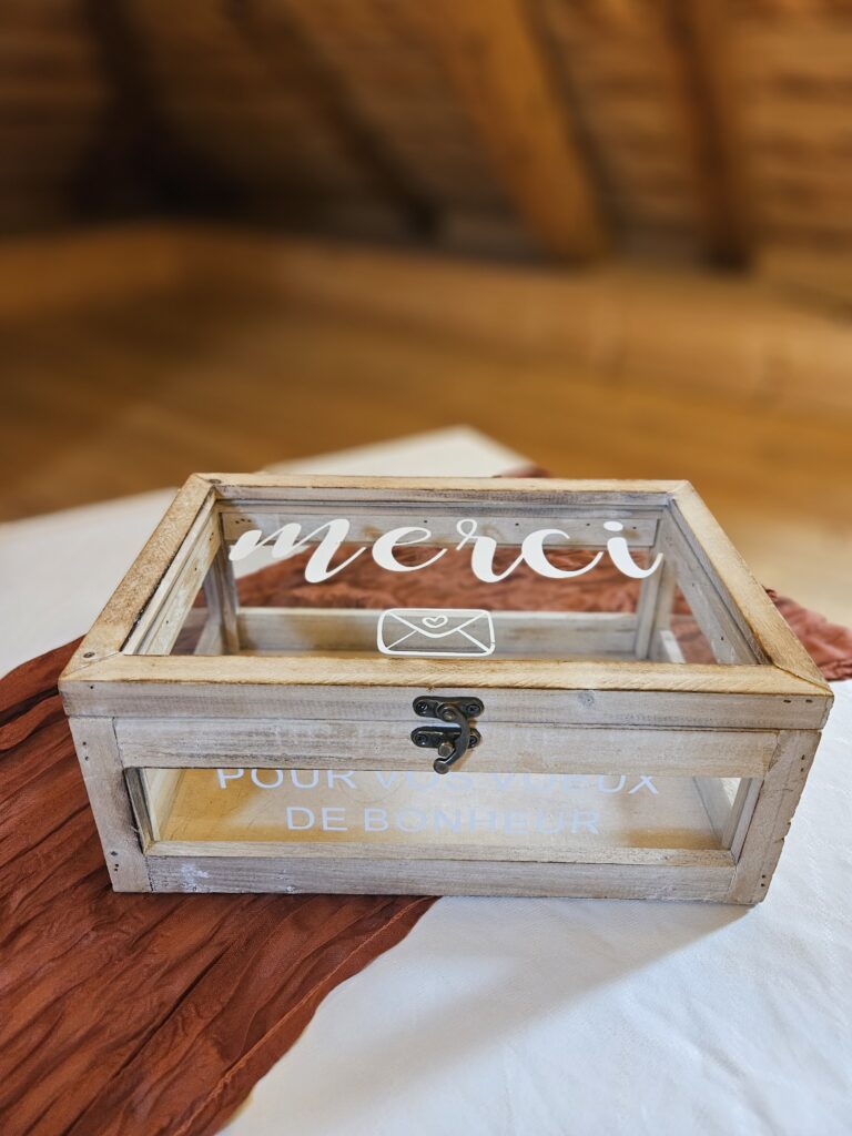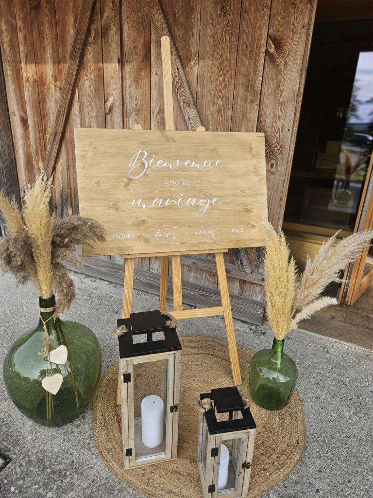 Matériel à louer Panneaux Bois Boîtes diverses (alliances, enveloppes, …) Lanternes et dame-jeanne Bougeoirs, vases, fontaines à eau Bougeoir à pois Vase à lignes Vase à pois Bonbonnière Fontaine à eau Numéros de tables Objets décoratifs, panier et noeud de chaise